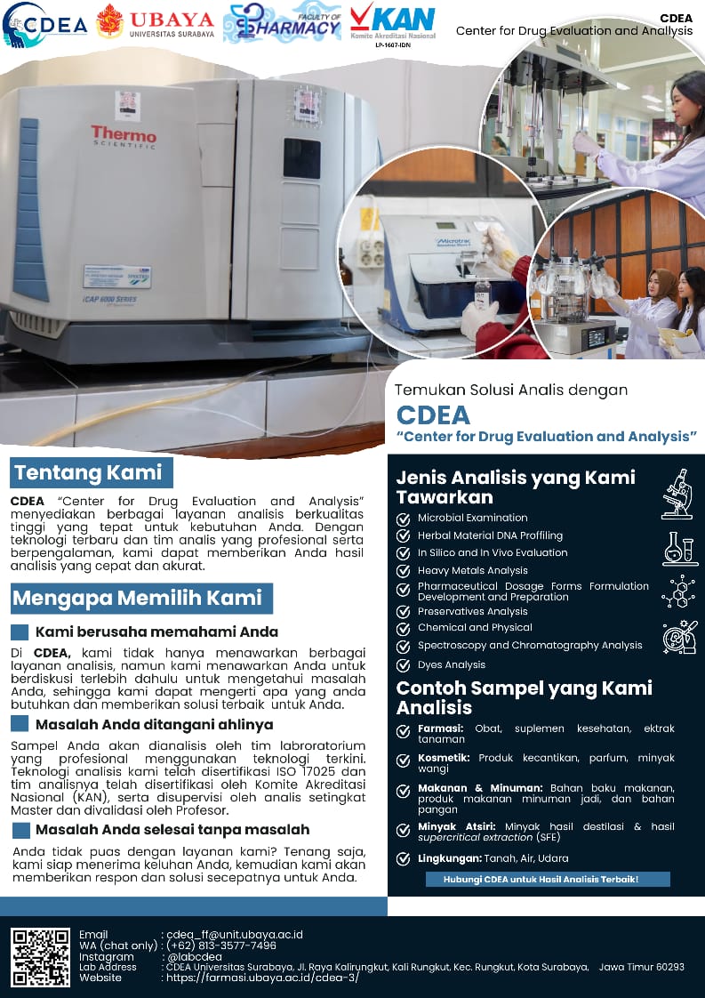 Center for Drug Evaluation and Analysis is an analytical laboratory which perform physico-chemical, microbiological, and heavy metal analysis in pharmaceutical dosage form, food, beverages, cosmetics, herbal products, supplements, stones, soil, water, as well as solid and liquid wastes.