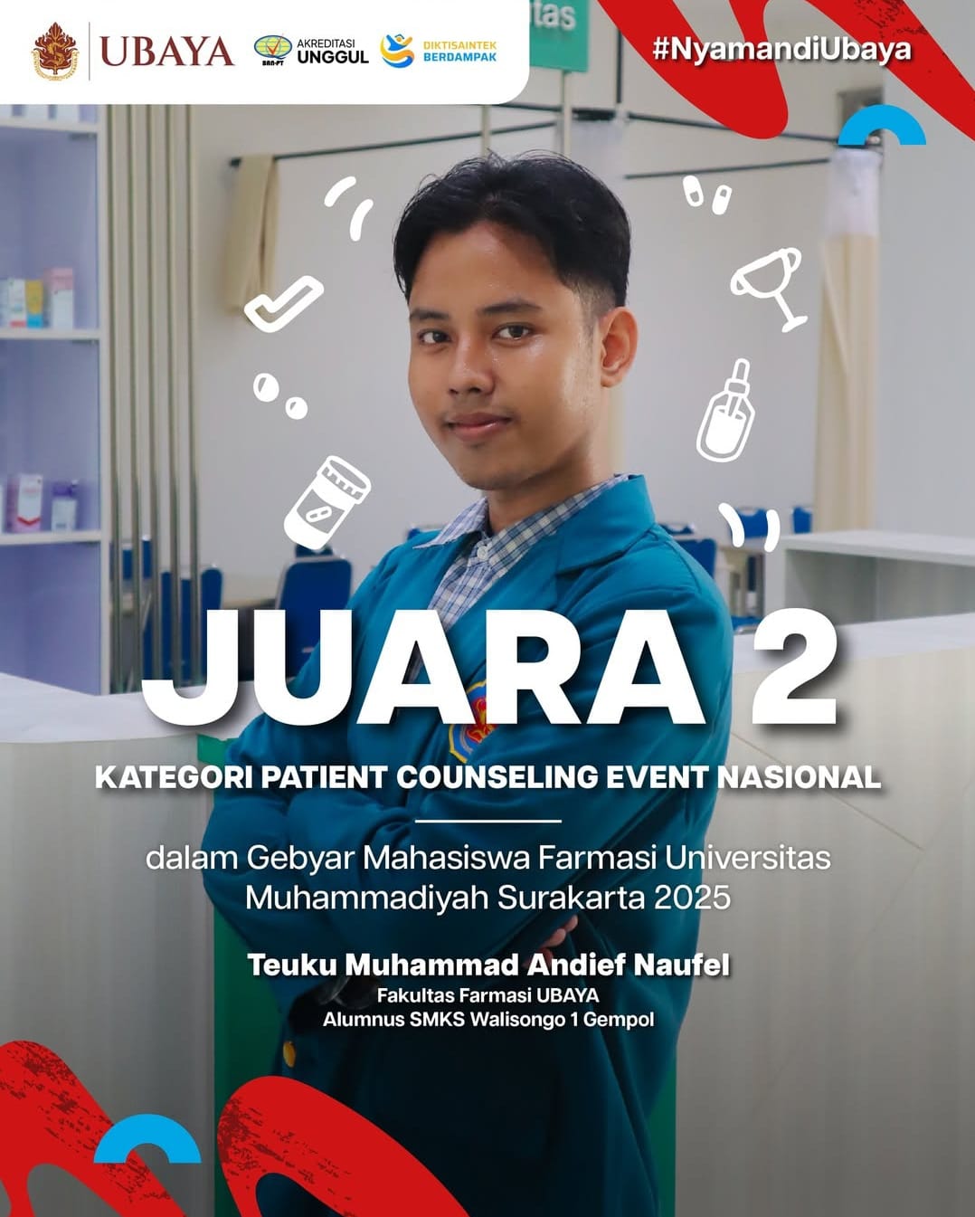 - Juara 2 Kategori Event Patient Conseling Nasional Gebyar Mahasiswa Farmasi Universitas Muhammadiyah Surakarta 2025