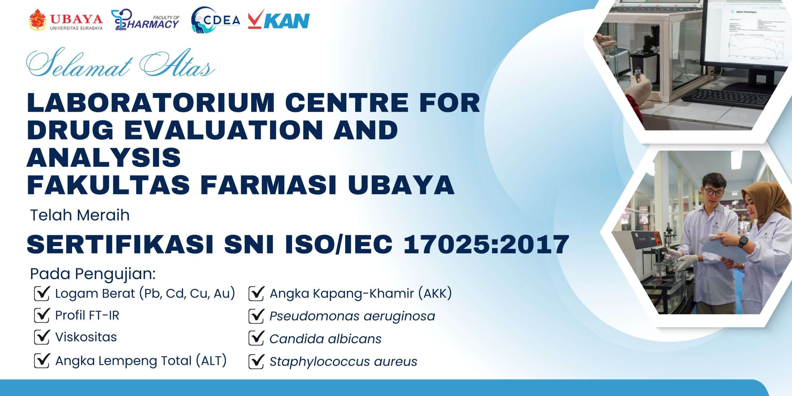 Fakultas Farmasi UBAYA merupakan salah satu dari tiga fakultas pertama di lingkungan Universitas Surabaya (UBAYA) yang memperoleh status “Terdaftar” pada tahun 1968. Perjuangan panjang segenap sivitas akademika Fakultas Farmasi telah menghasilkan pencapaian dengan perolehan status “Disamakan” pada tanggal 21 Agustus 1995 yang berlanjut dengan perolehan akreditasi dari Badan Akreditasi Nasional Perguruan Tinggi (BAN-PT) dengan peringkat “A” sejak tahun 1998. Selanjutnya peringkat yang sama dari LAM-PTKes (Lembaga Akreditasi Mandiri Perguruan Tinggi Kesehatan) sejak 2011 sampai saat ini. Fakultas Farmasi juga berhasil memperoleh sertifikasi Internasional dari ASEAN University Network-Quality Assurance (AUN-QA) pada tahun 2019, disusul sertifikasi internasional dari ACPE (Accreditation Council for Pharmacy Education) pada tahun yang sama. Saat ini Fakultas Farmasi memiliki 3 (tiga) program studi (PS) yaitu: